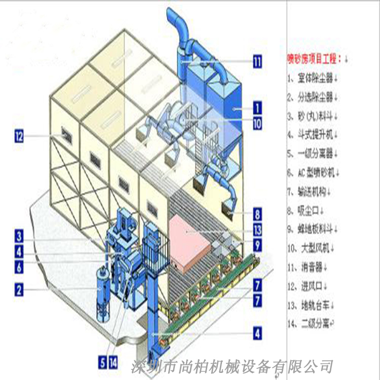 机械循环回收式喷砂房成套设备主要由喷砂房室体、照明系统、空气动力回收地板、分选器、喷砂系统、除尘器、风机、控制系统、工件输送系统及操作人员防护系统组成。